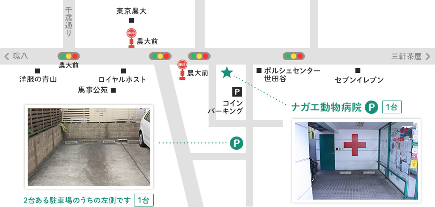病院入口に1台,至近に1台(徒歩1分)の専用駐車場をご用意しております。